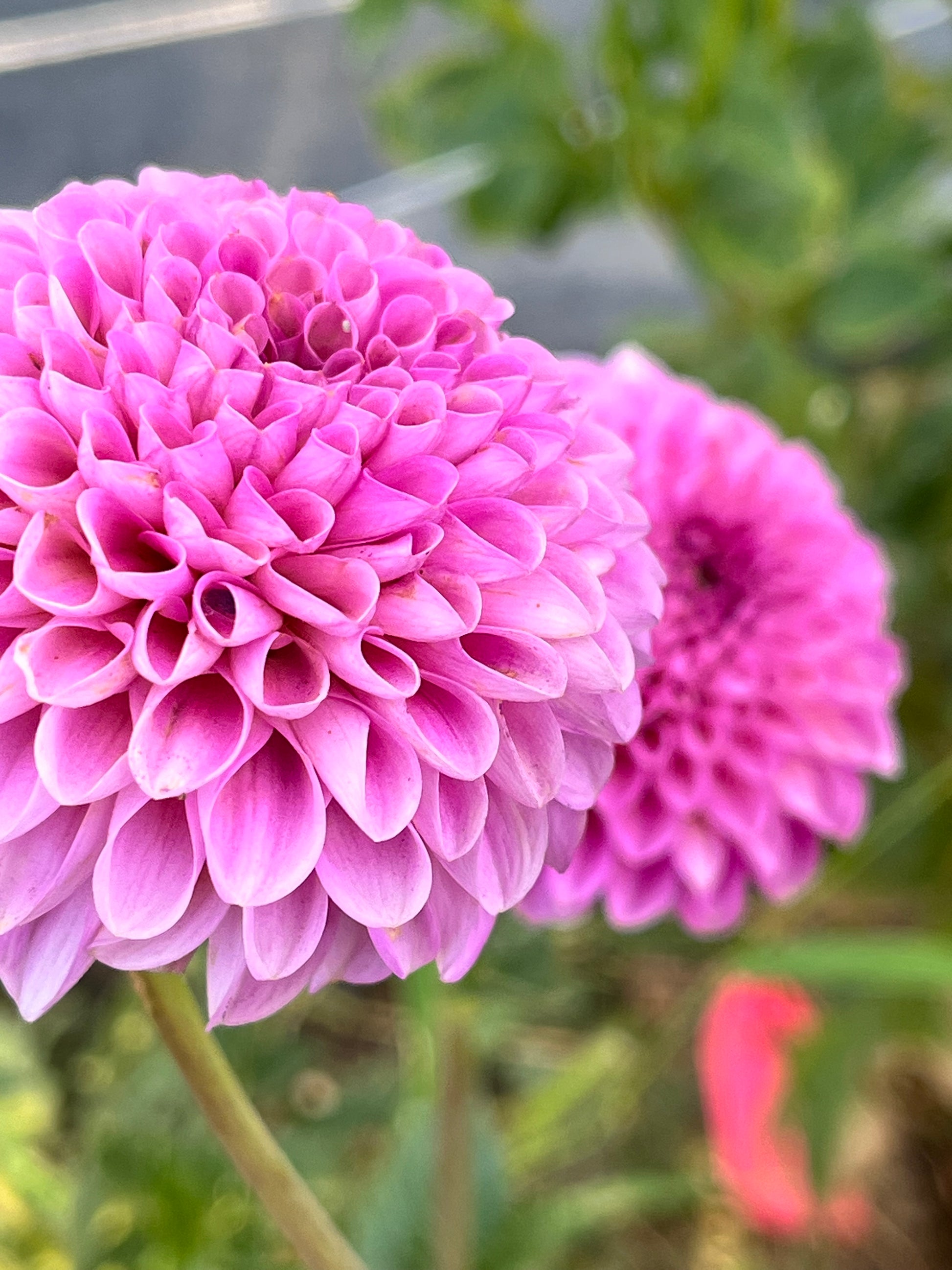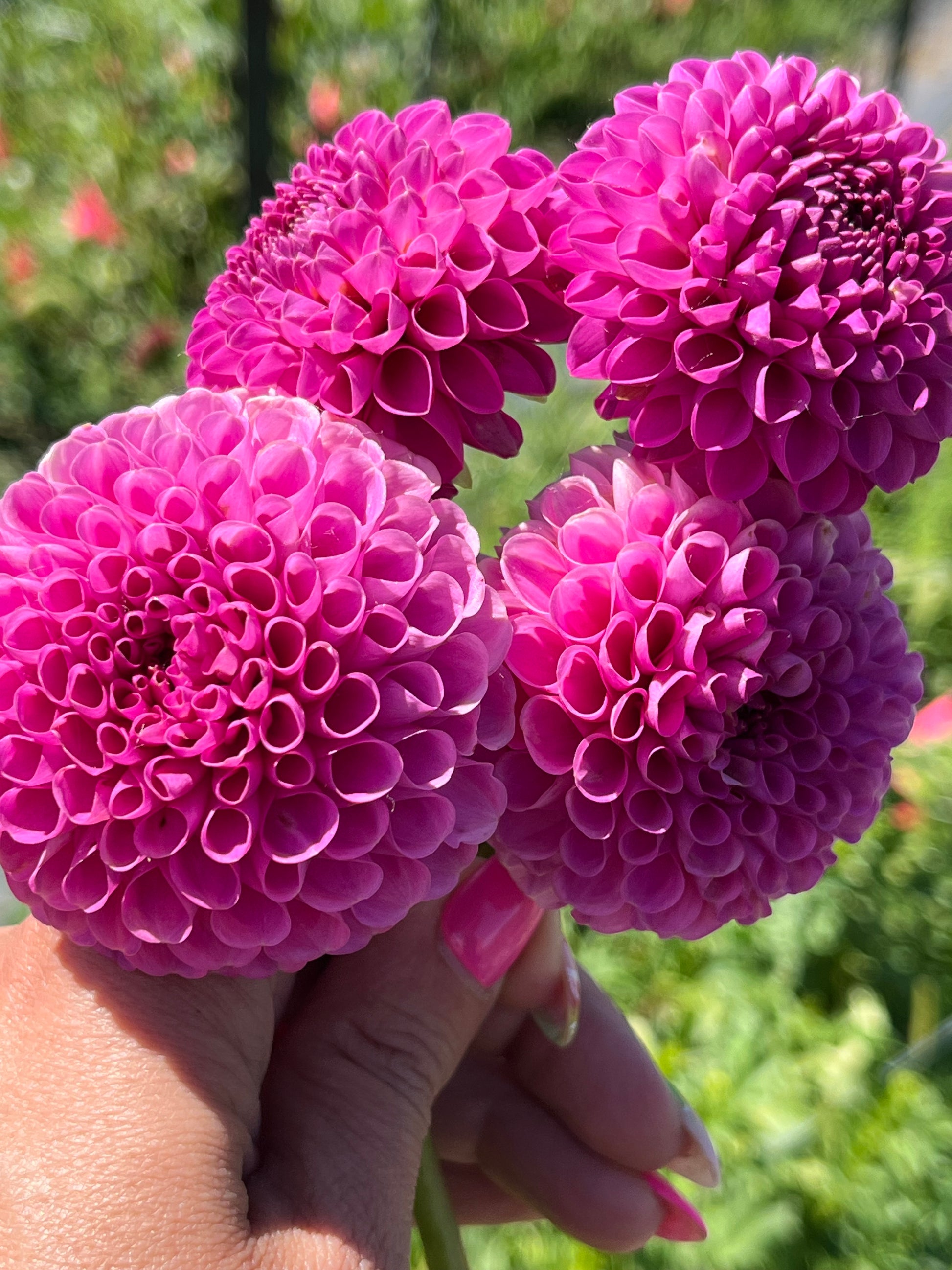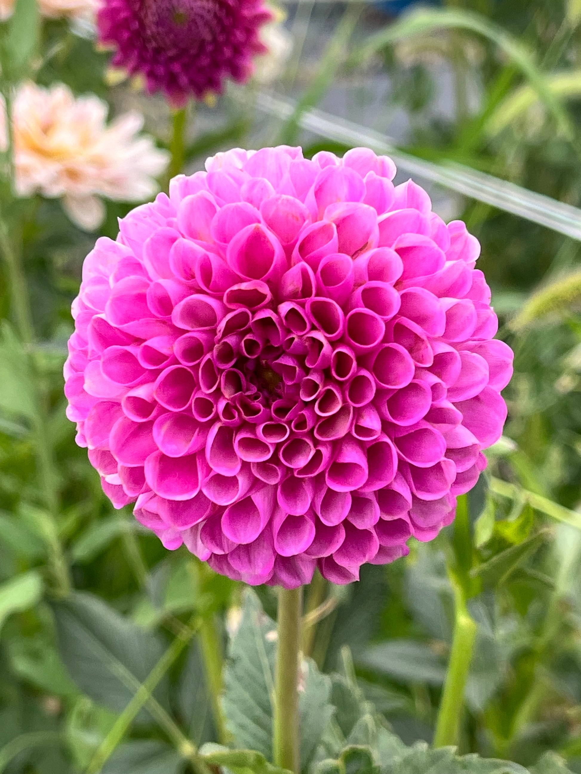 A miniature ball dahlia with soft peach-apricot petals infused with pink, giving each bloom a warm, glowing depth. Compact in size but full of charm, her perfectly rounded flowers add elegance to the garden and long-lasting beauty to arrangements.
