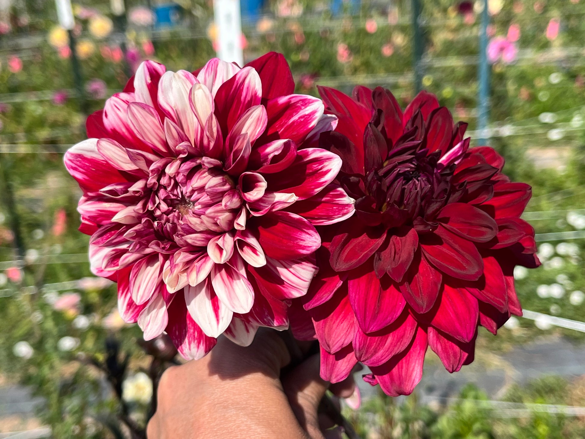 A dramatic dahlia with some of the deepest foliage you’ll find, creating a striking contrast against its unpredictable blooms. Flowers shift in color from pale blush and white to dark red brushed with white, making every stem a little different and full of surprise.