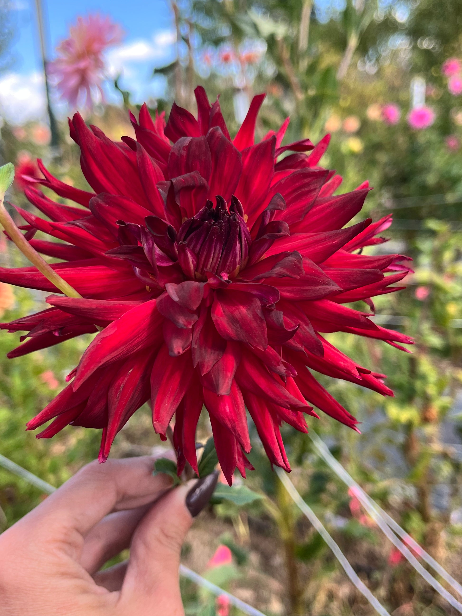 A dramatic dark red cactus dahlia with long, quilled petals that create a bold, spiky texture. Its unusual form and rich color give it a striking presence in the garden and a unique flair in arrangements.