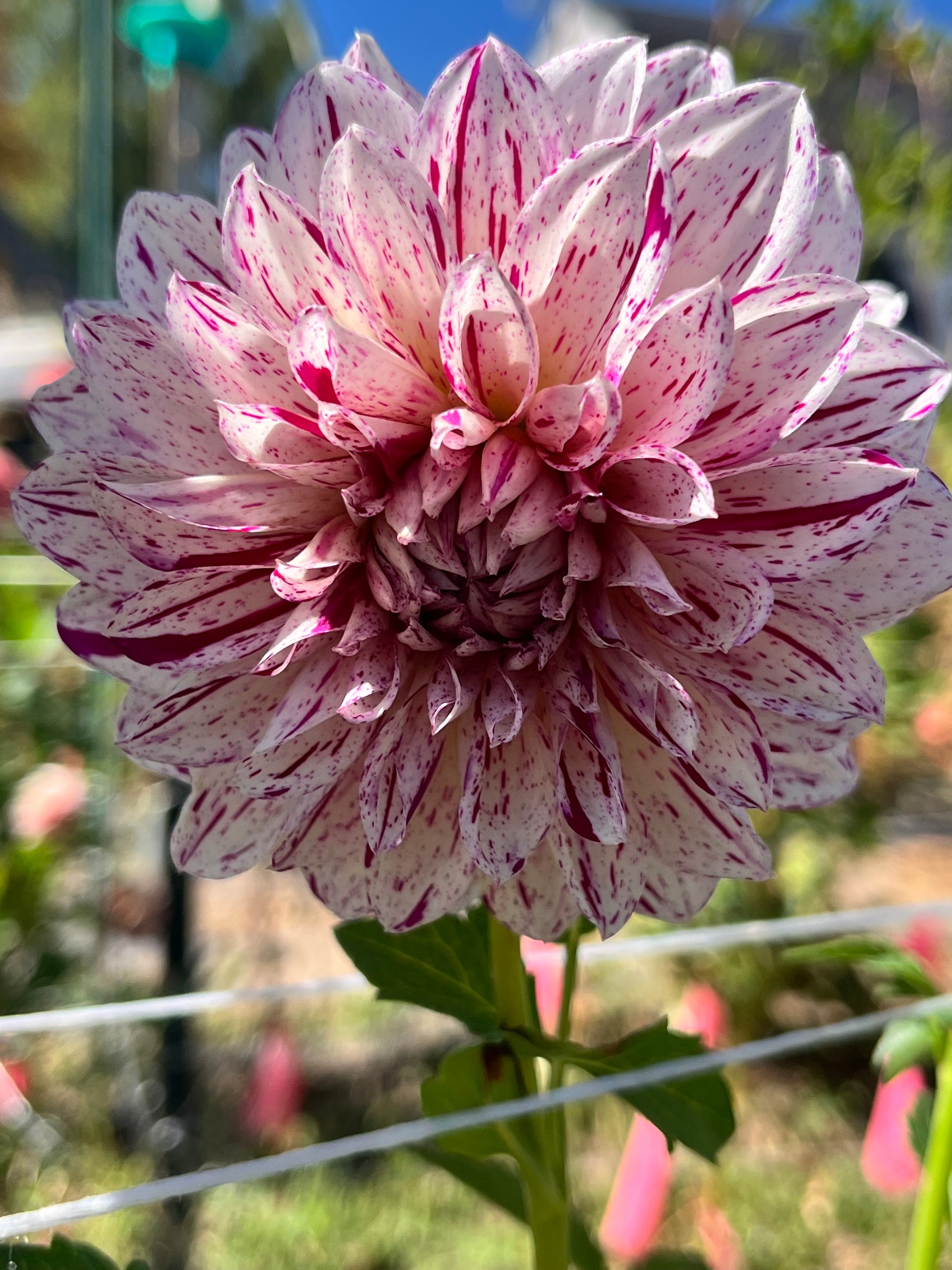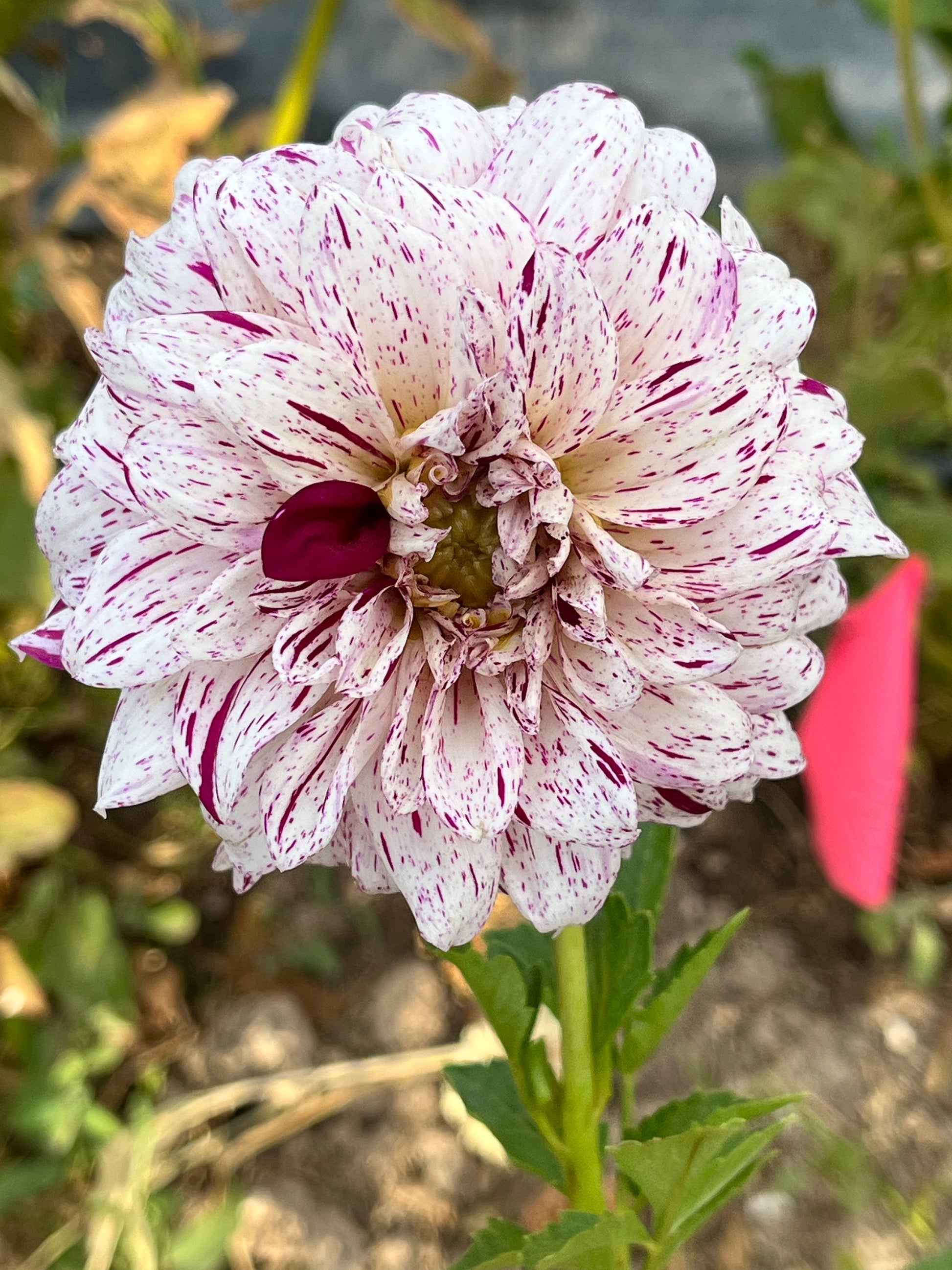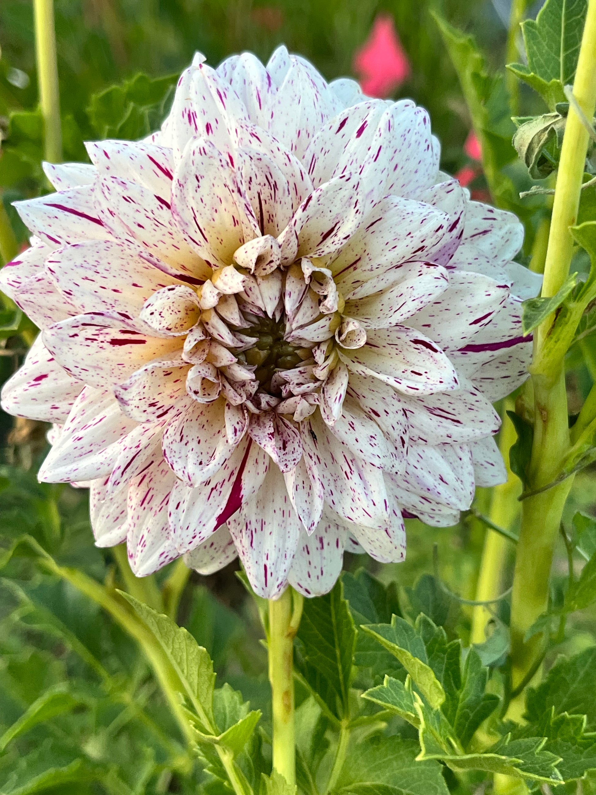 A dazzling variegated dahlia whose petals are a canvas of white streaked and flecked with magenta, purple, and pink. No two blooms are alike, some might carry bold splashes of color, others only delicate speckles. Its uniquely painted look makes it a showpiece in beds and an eye-catcher in arrangements.