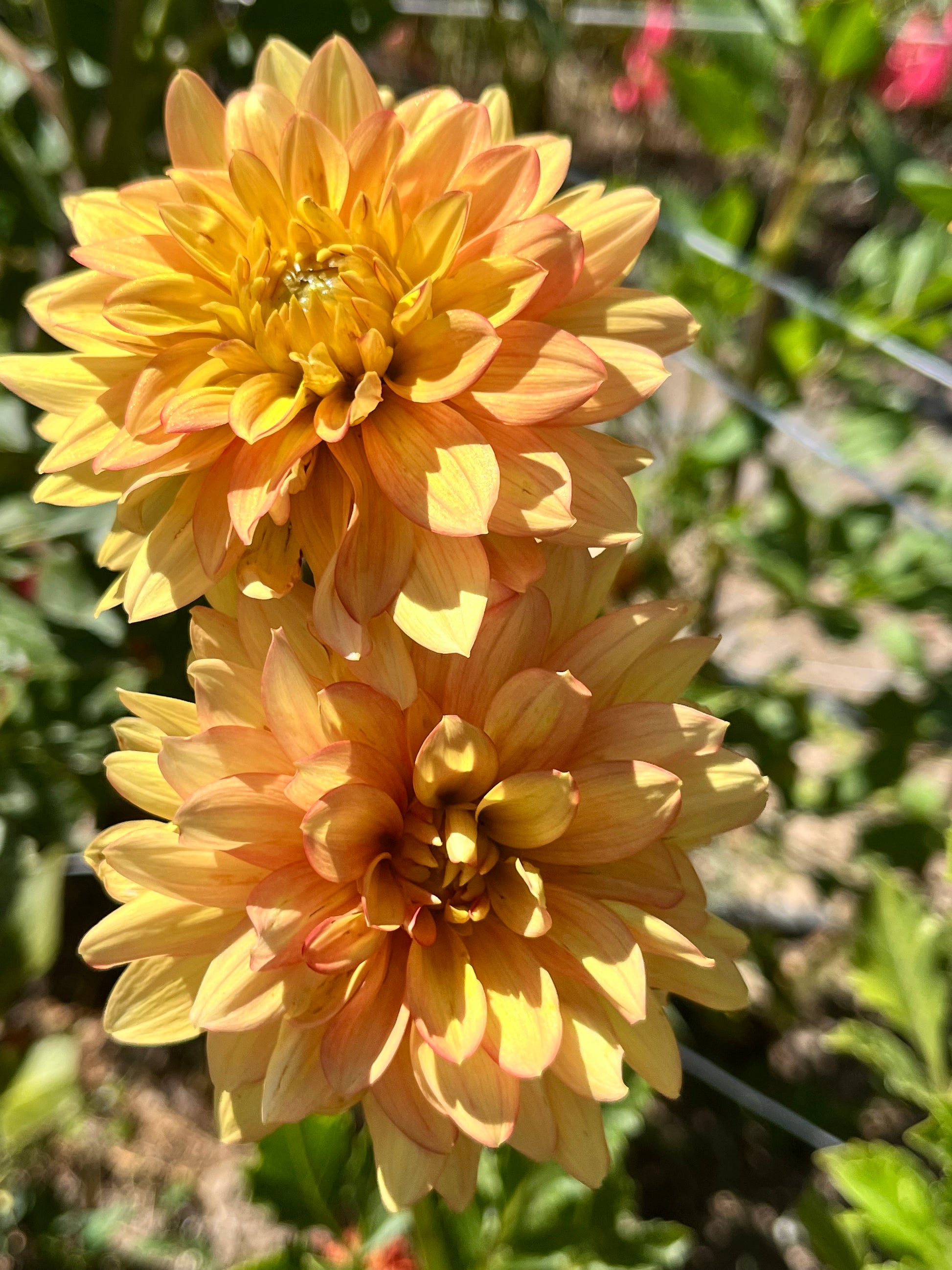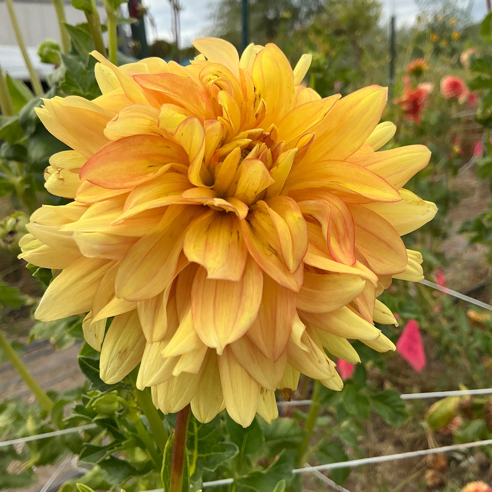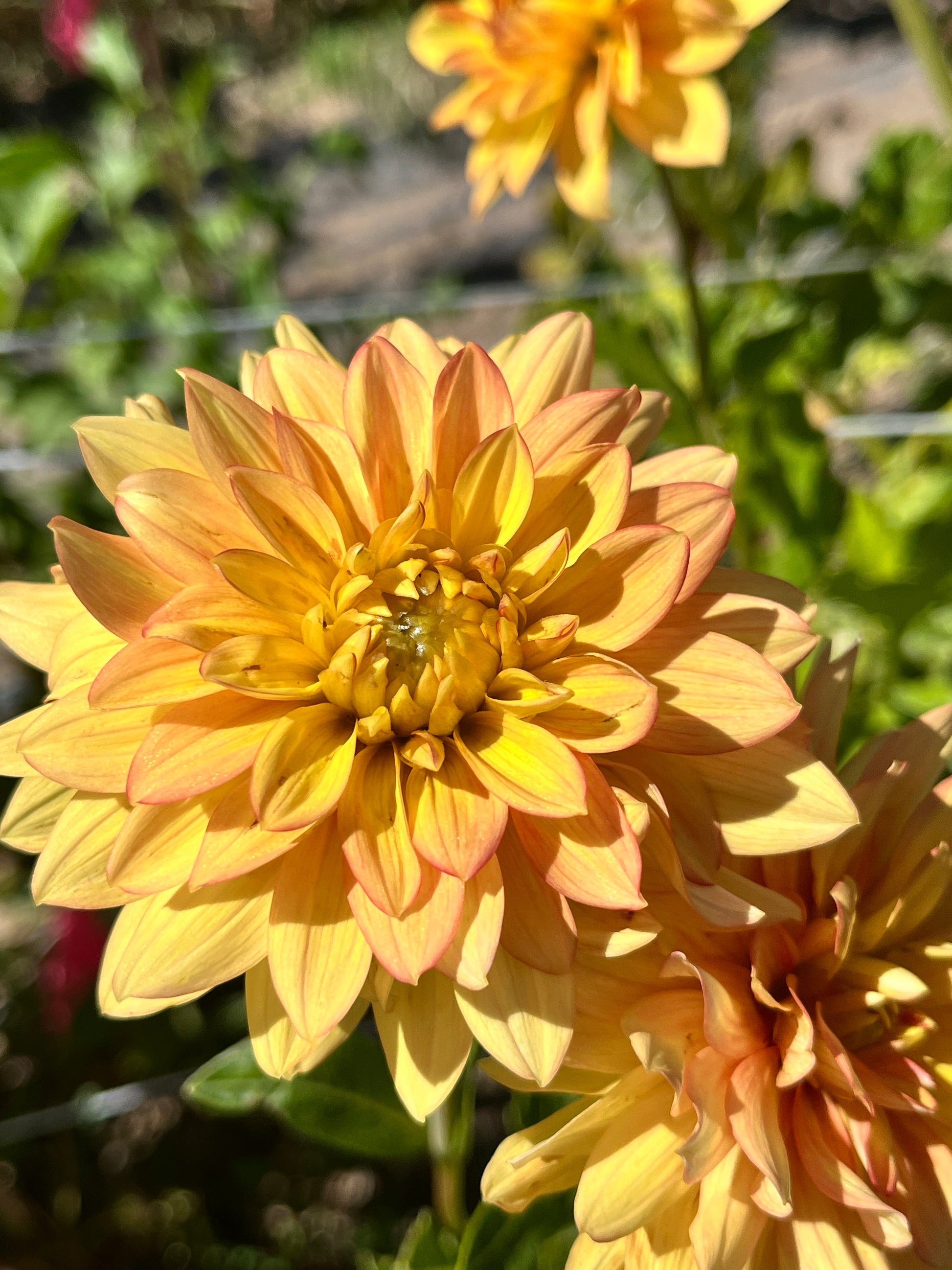 A radiant dahlia glowing in golden yellow brushed with warm apricot and kissed with soft pink along the petal edges. Its blooms seem to carry their own inner light, giving both garden beds and bouquets a cheerful, luminous warmth.