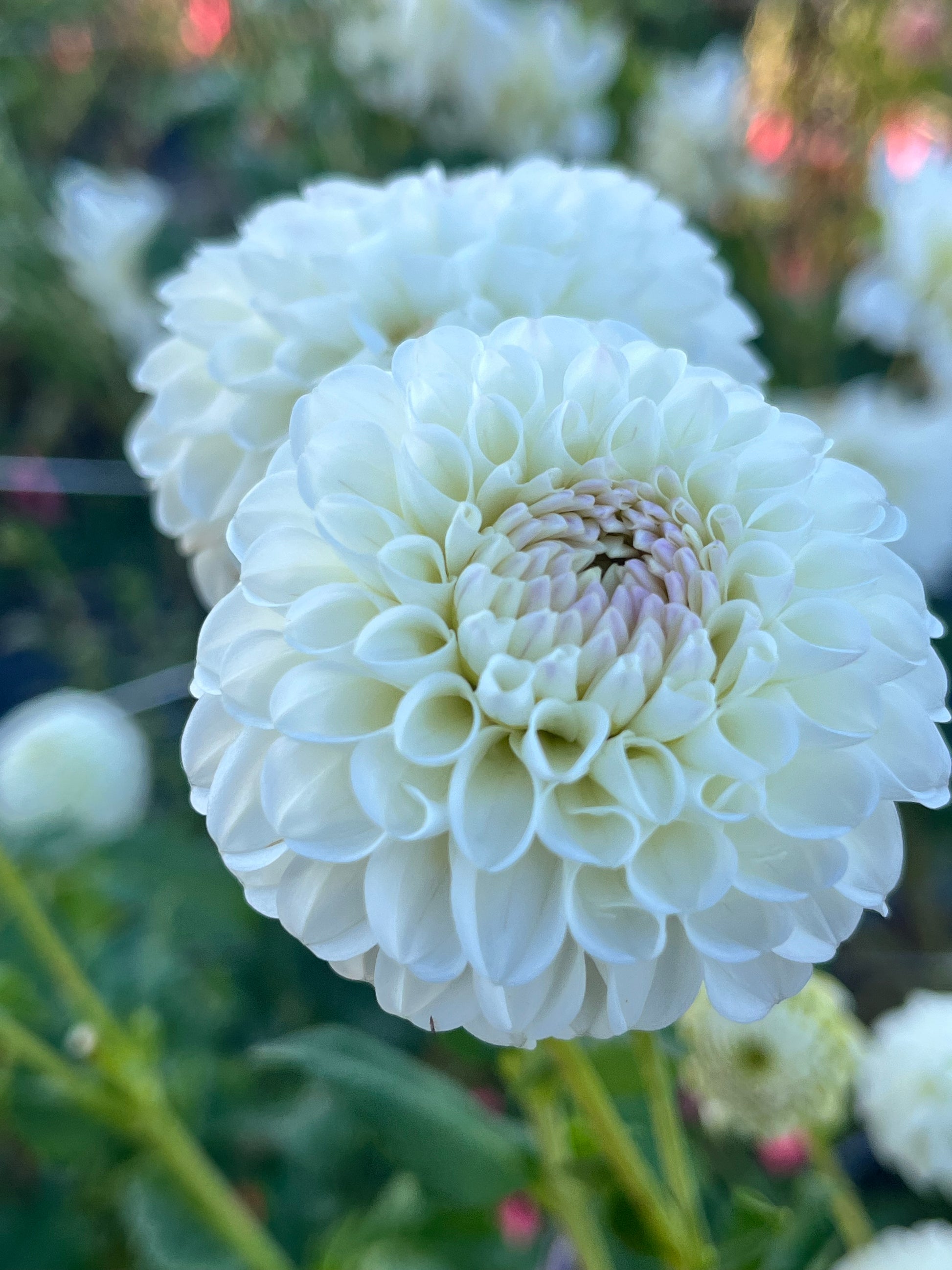 Luminous white miniature-ball blooms with a soft lavender blush at the heart, giving each flower a gentle, ethereal depth. Its pure white “shells” contrast beautifully with the center’s faint tint, making it feel elegant.