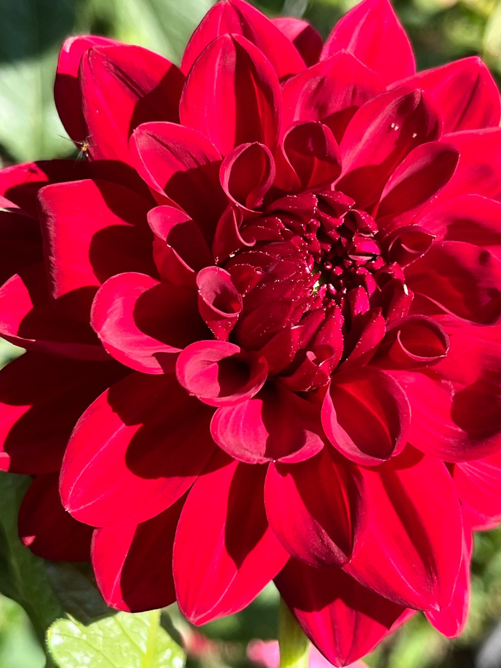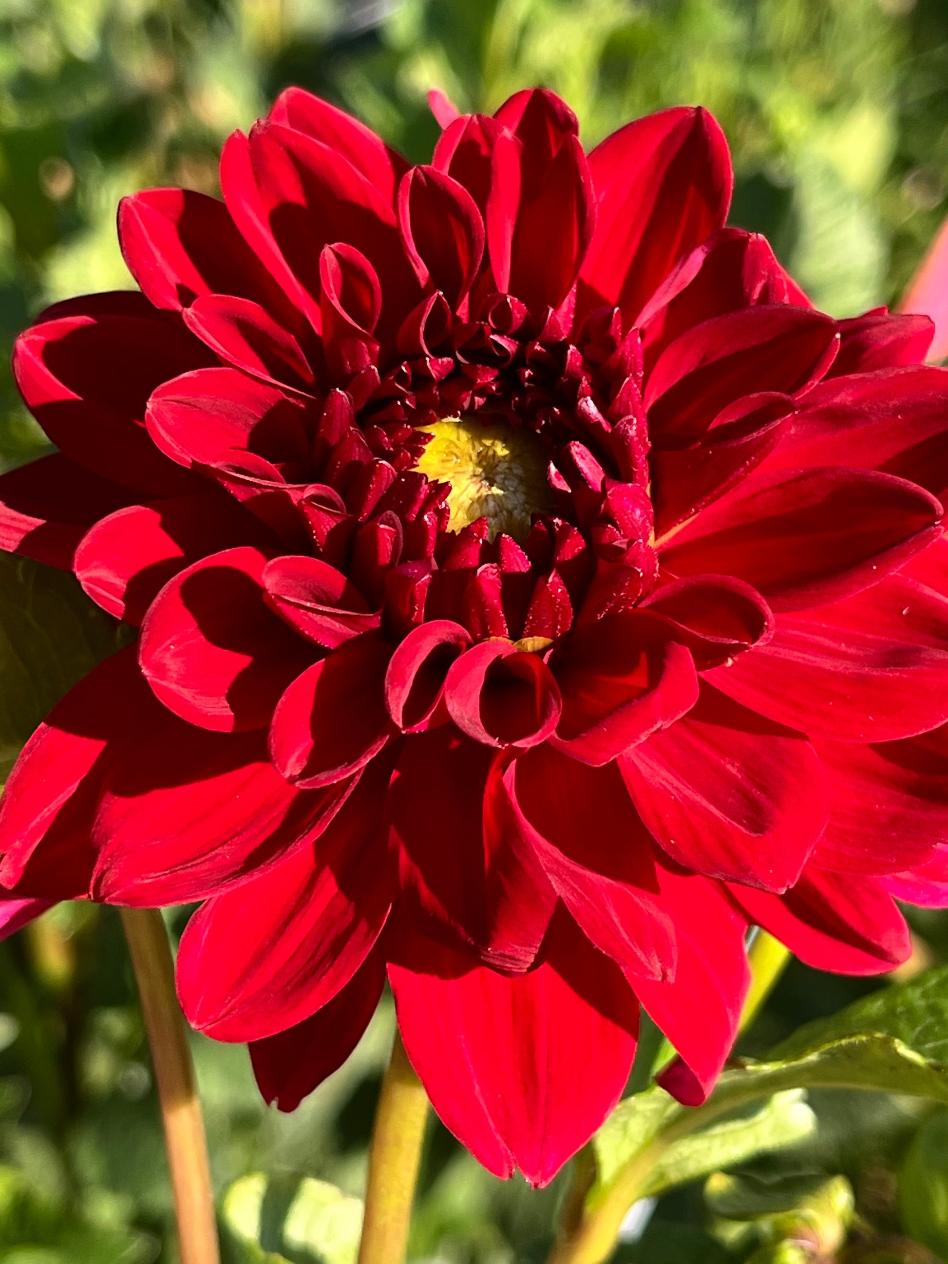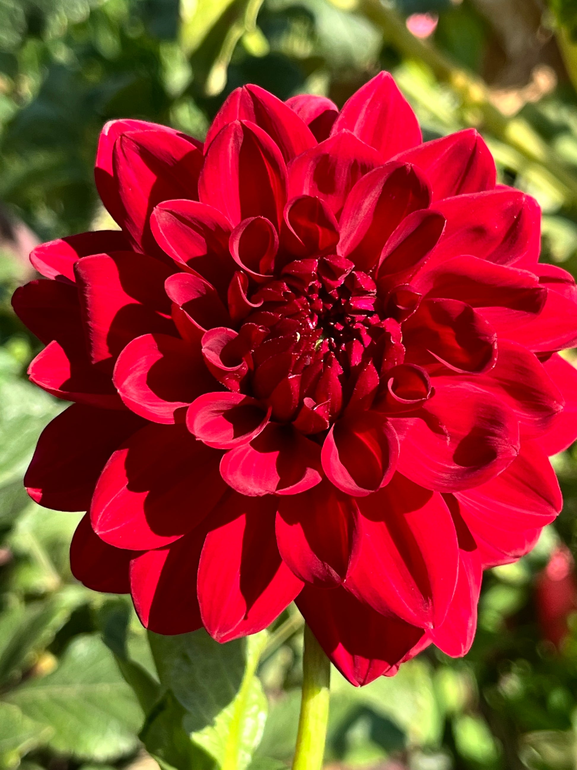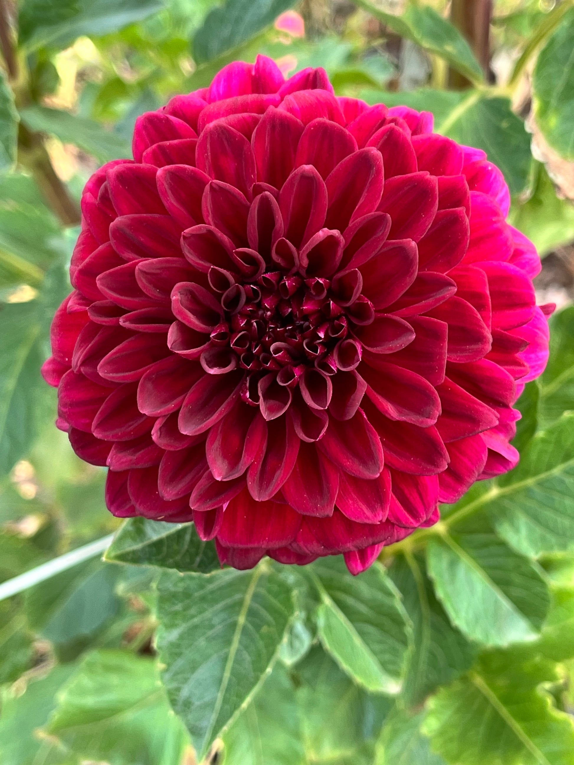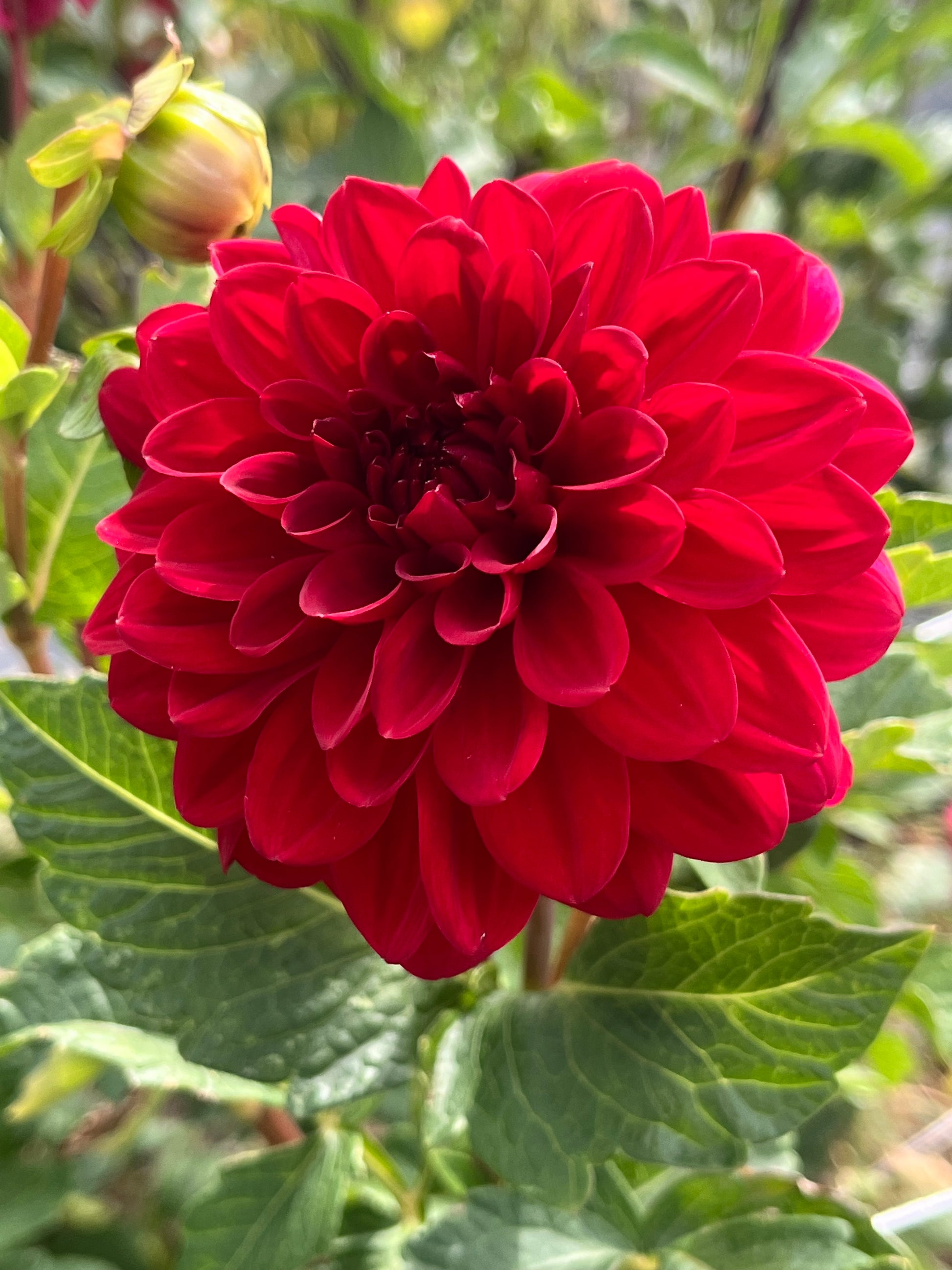 A rich, ruby-red formal decorative dahlia with perfectly rounded, fully doubled blooms that hold their color with striking depth. The flowers glow in the garden and are excellent for cutting, offering both bold presence and reliable form.