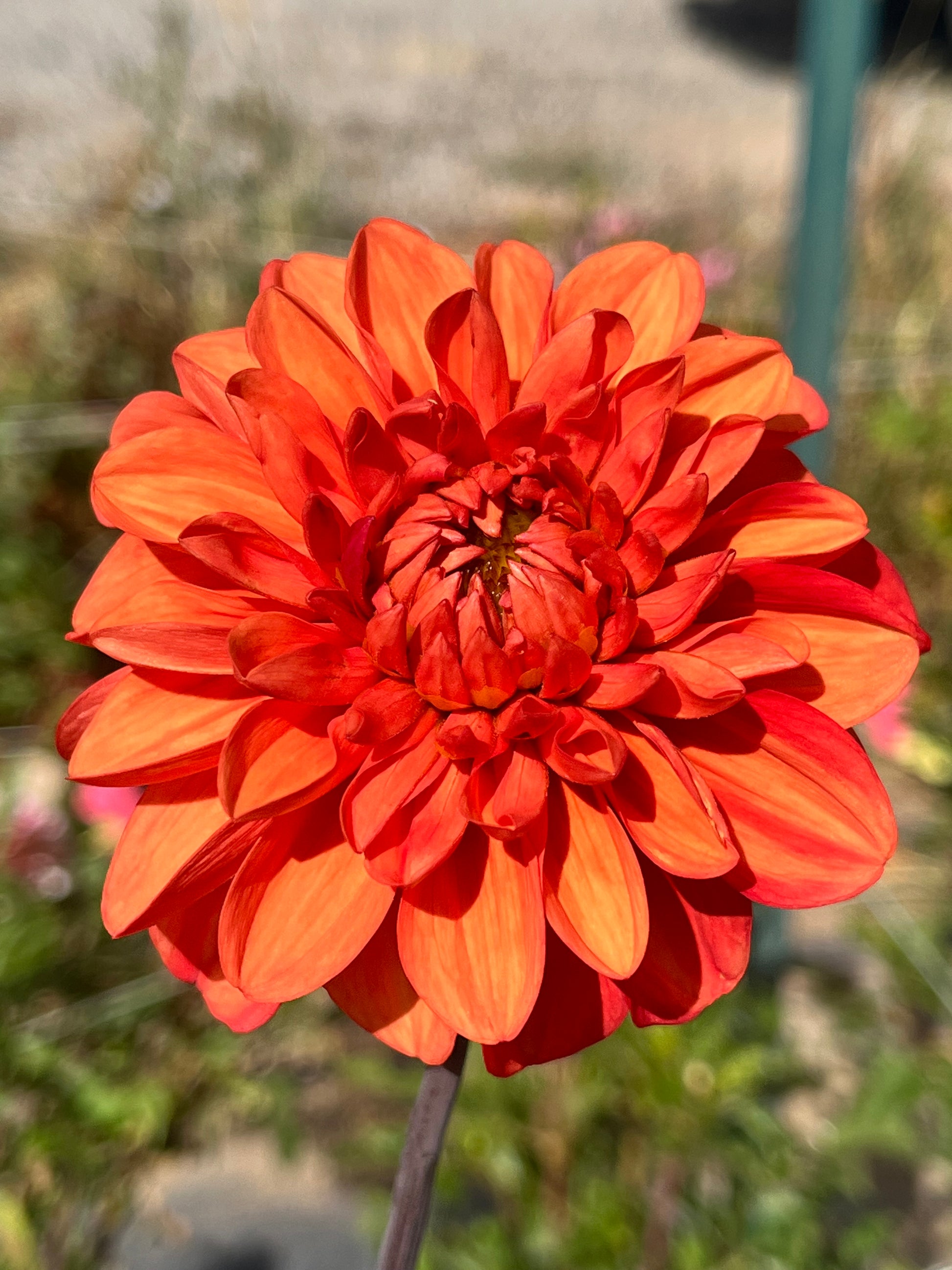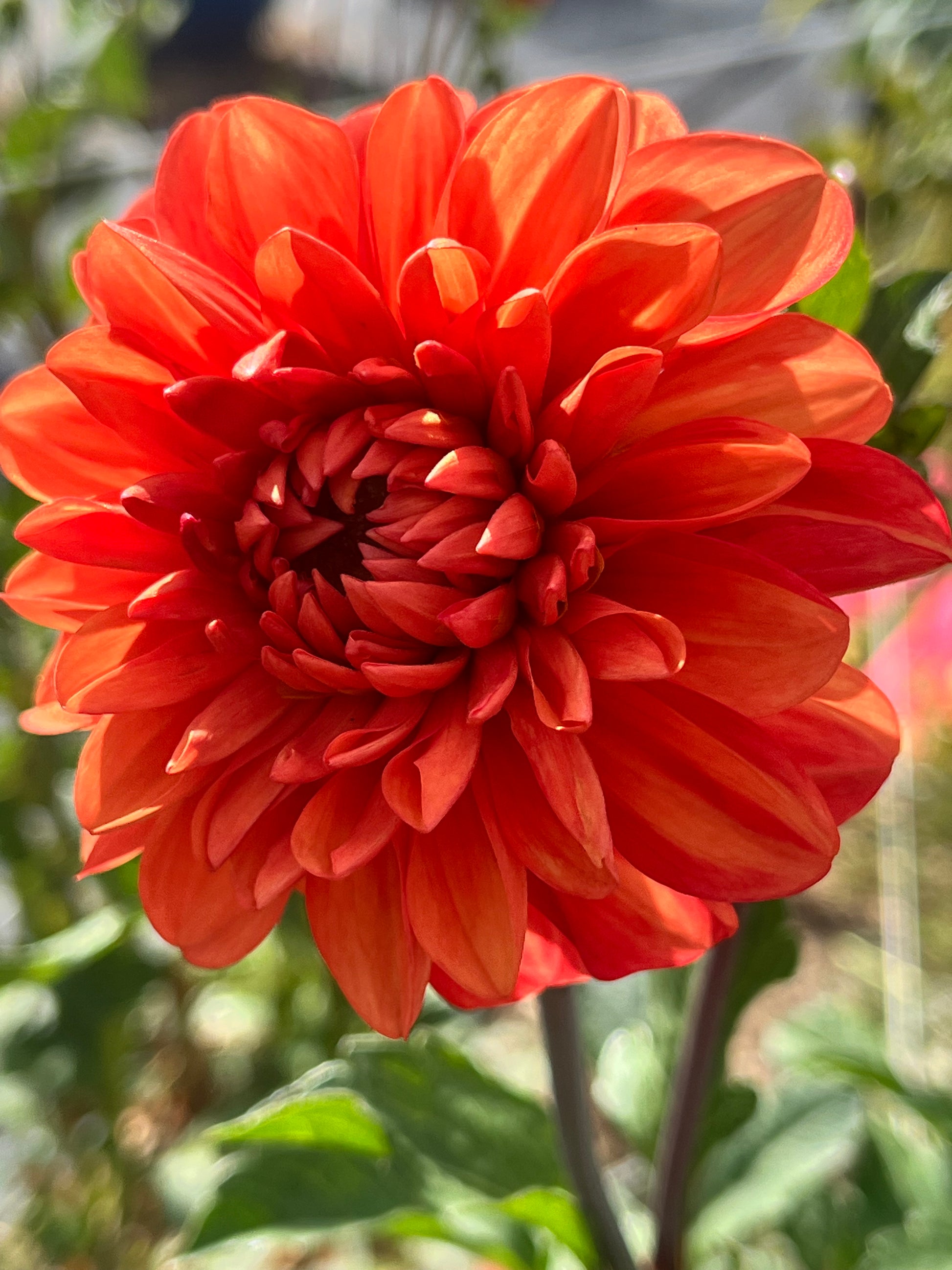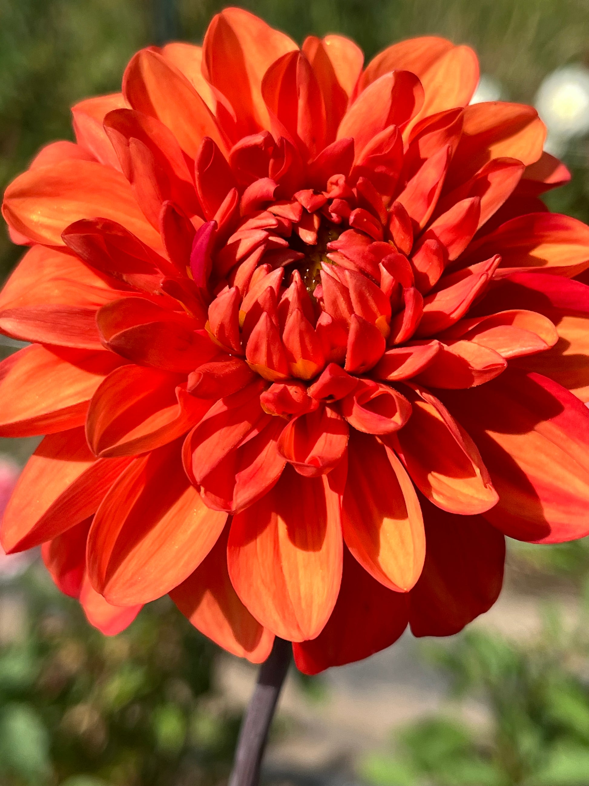 A glowing formal decorative dahlia in vivid shades of orange that shift between fiery tangerine and deeper sunset tones. Its broad, overlapping petals create a lush bloom that brings bold warmth to the garden and striking presence to cut arrangements.