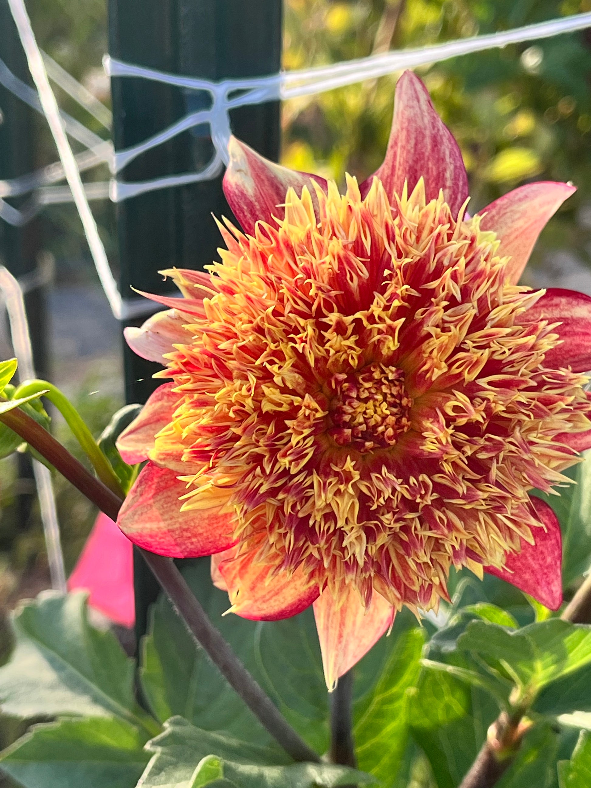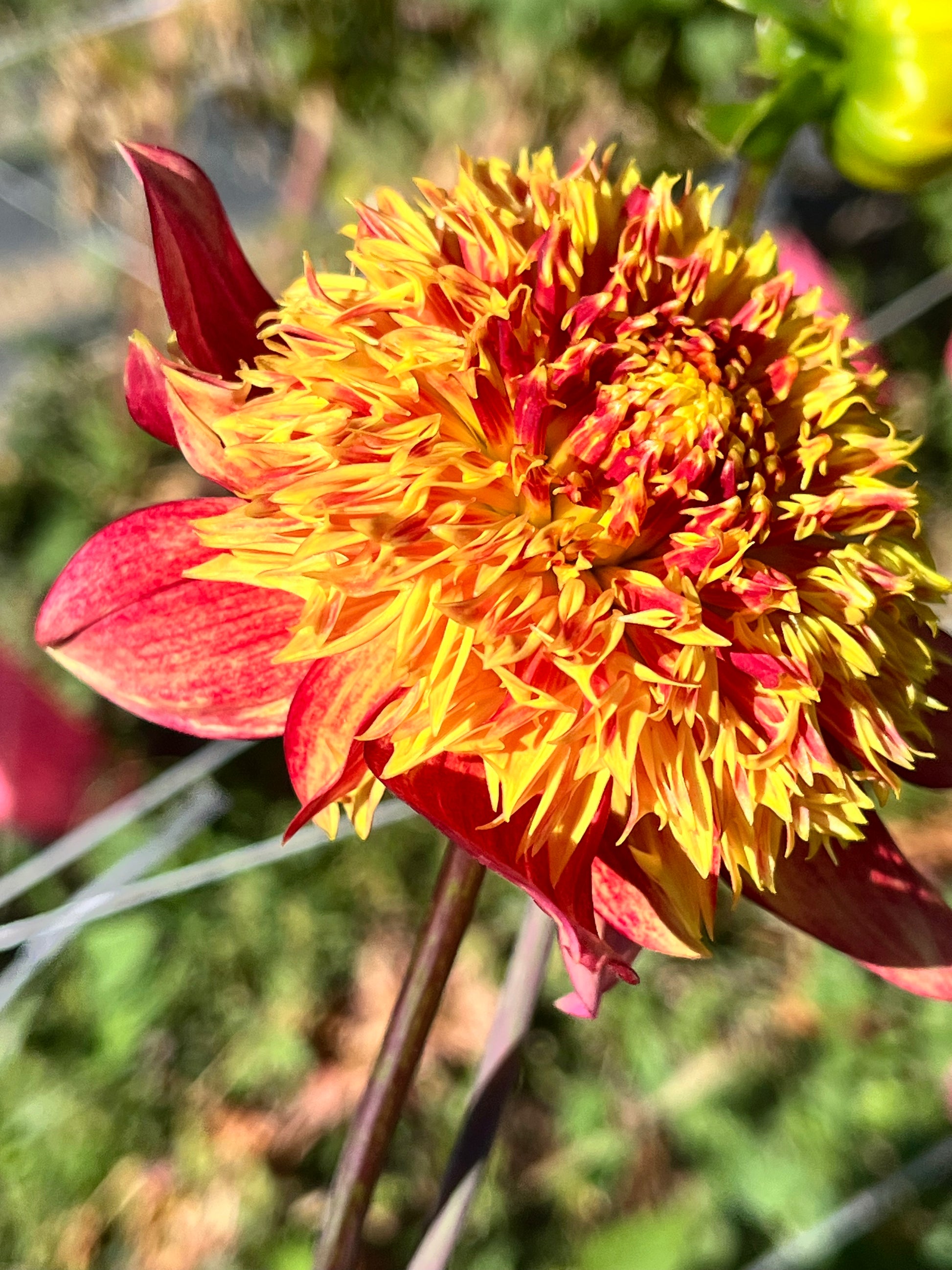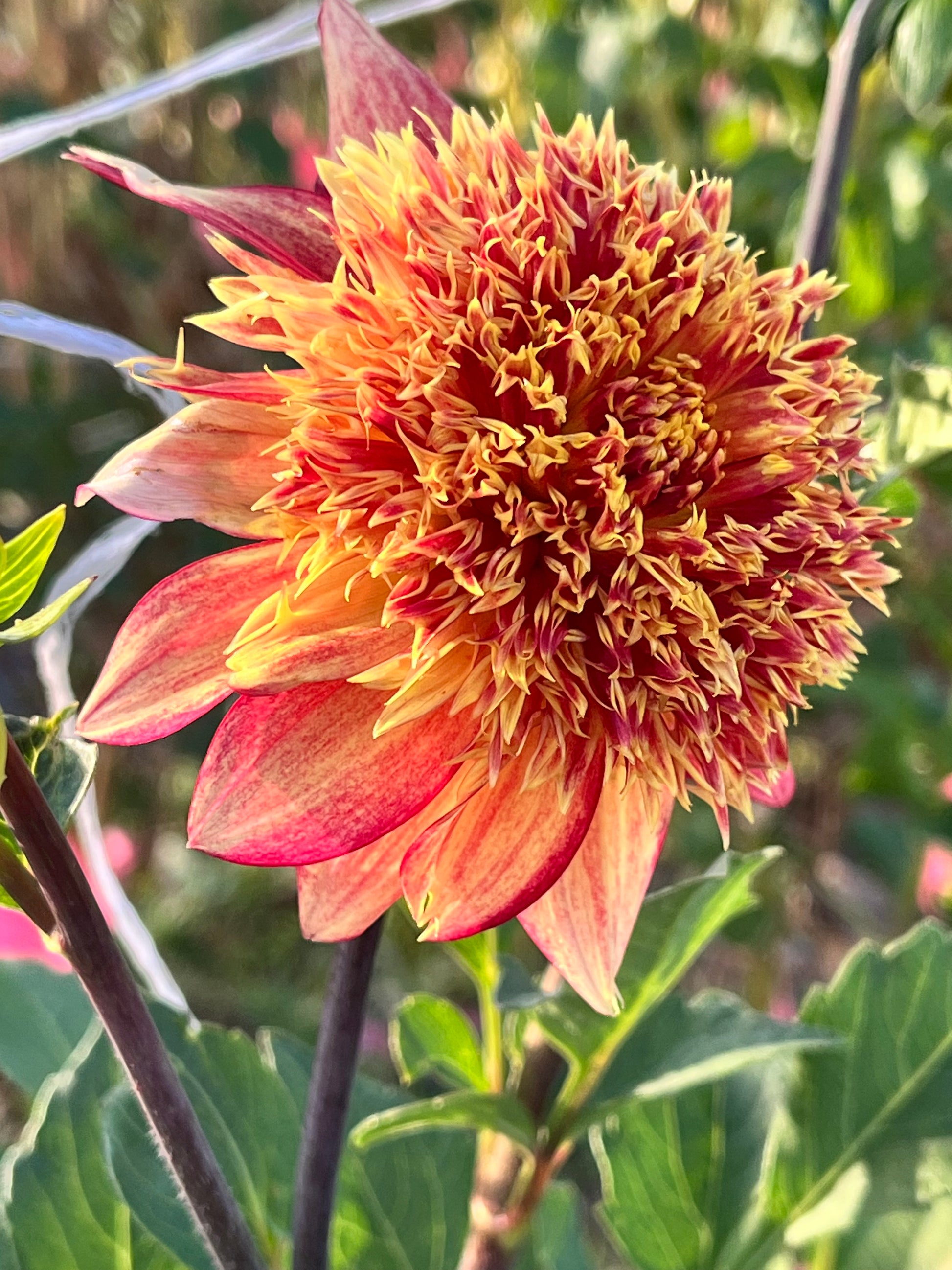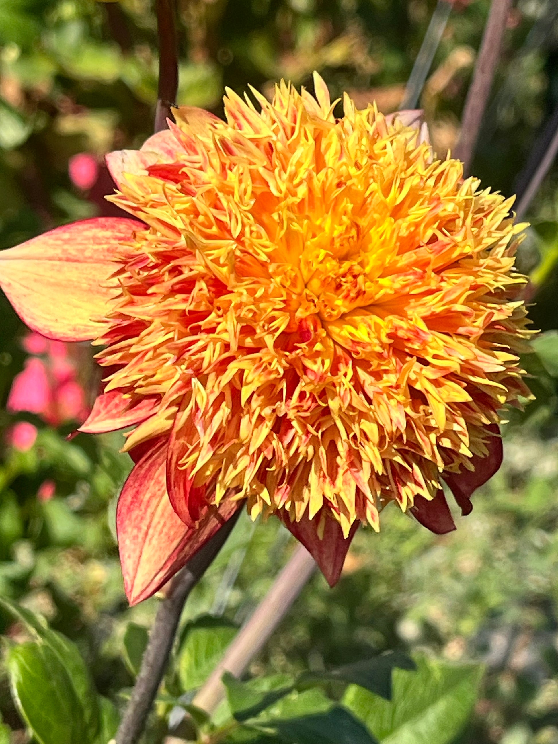 A playful anemone dahlia with fiery orange and golden-yellow petals forming a full, fluffy cushion at the center, framed by broad outer petals brushed in red.