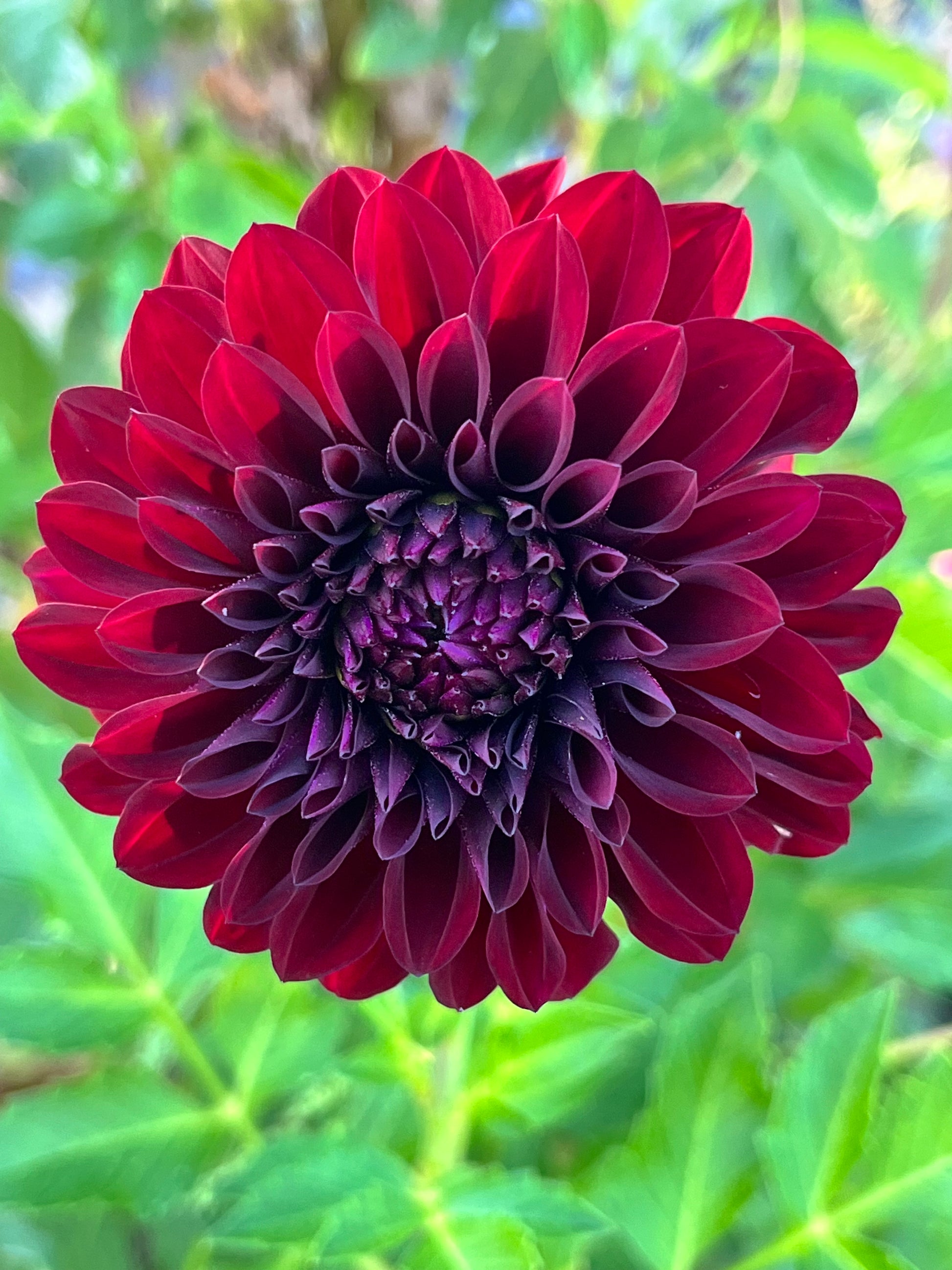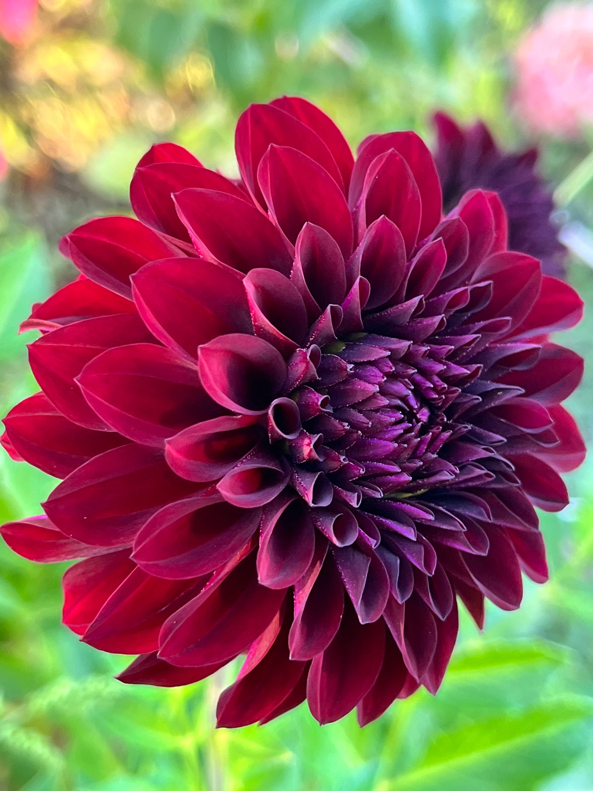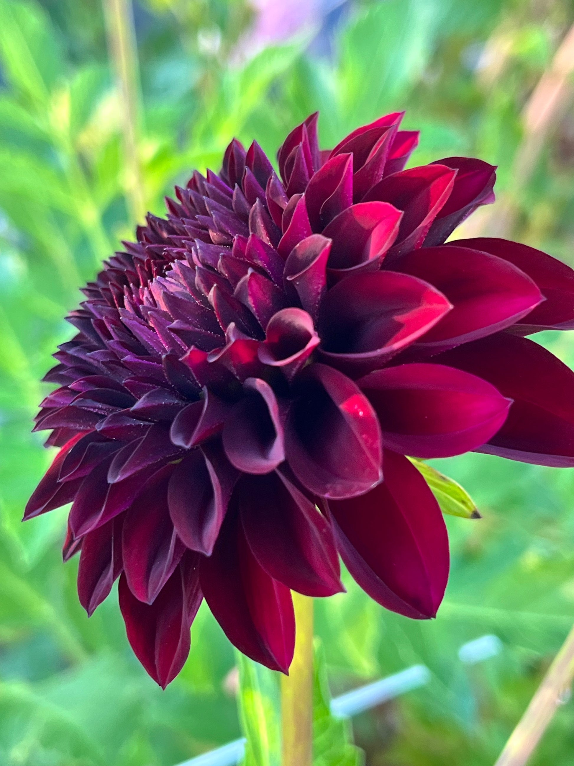 A velvety dahlia with rich, dark burgundy petals that deepen to near black at the base. The blooms catch the light with a soft sheen, creating an elegant, dramatic presence.
