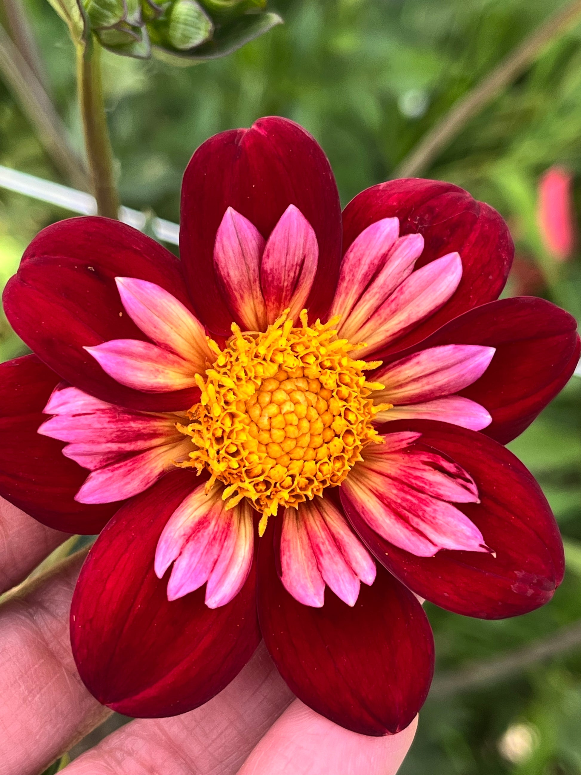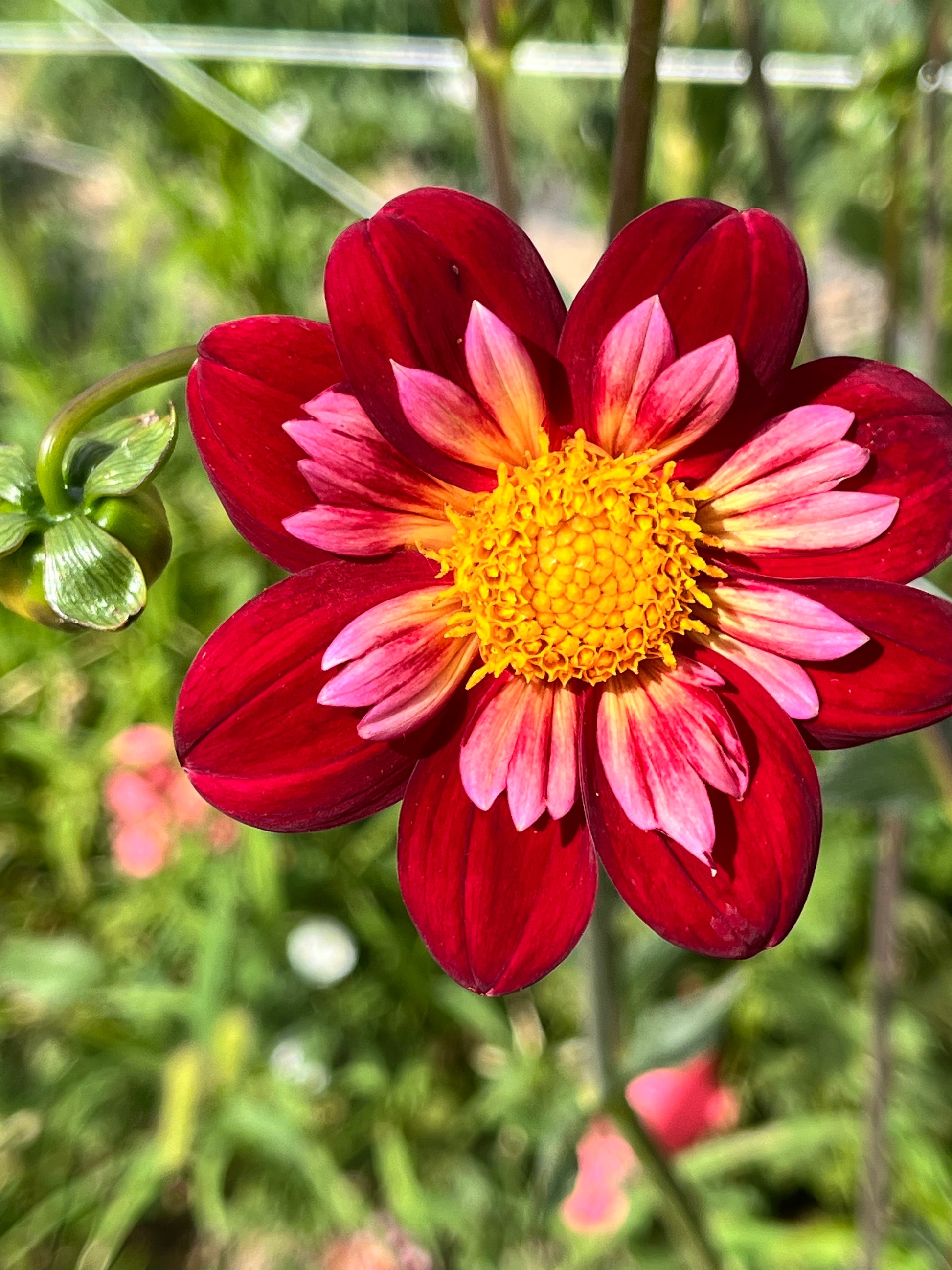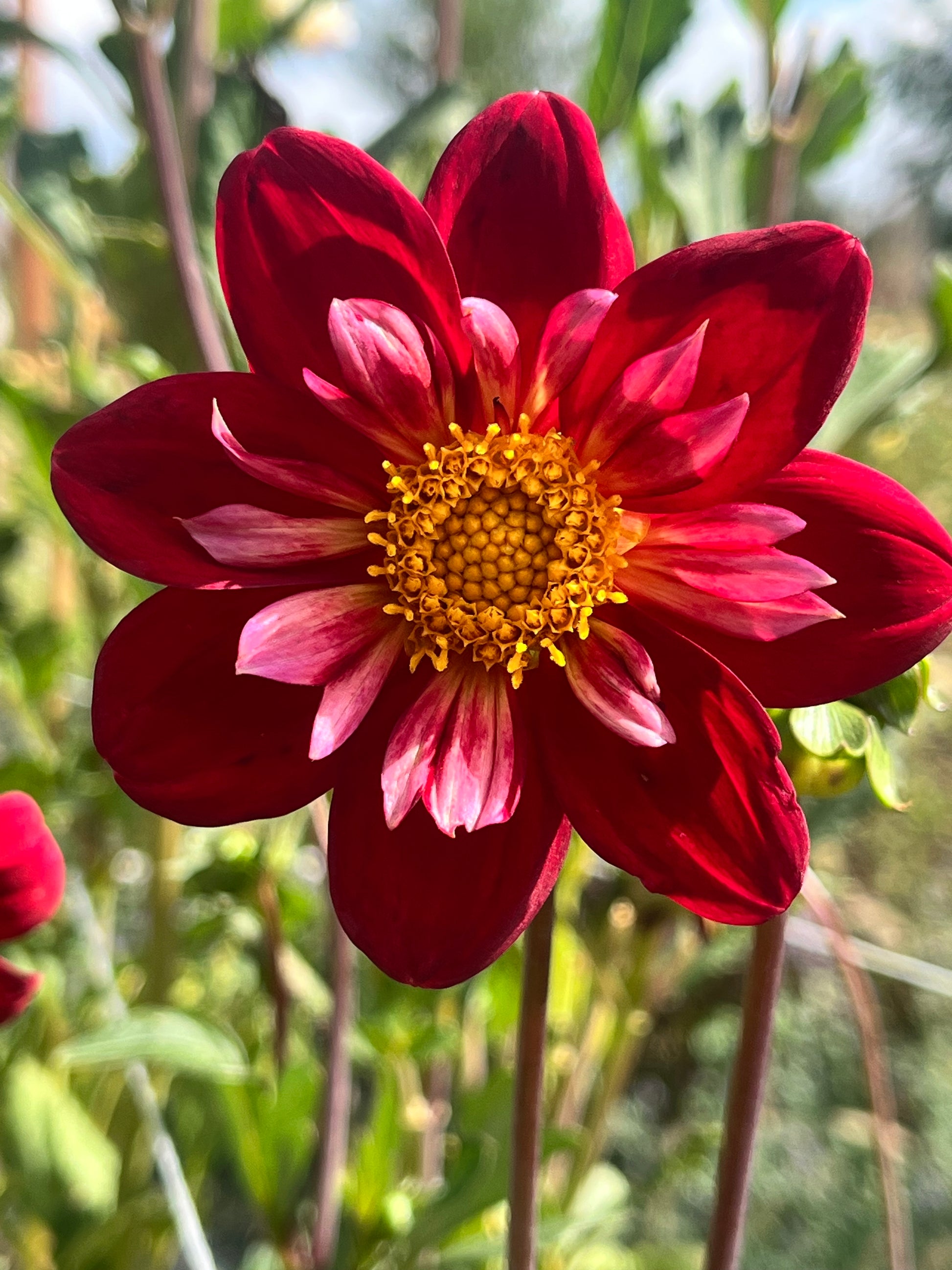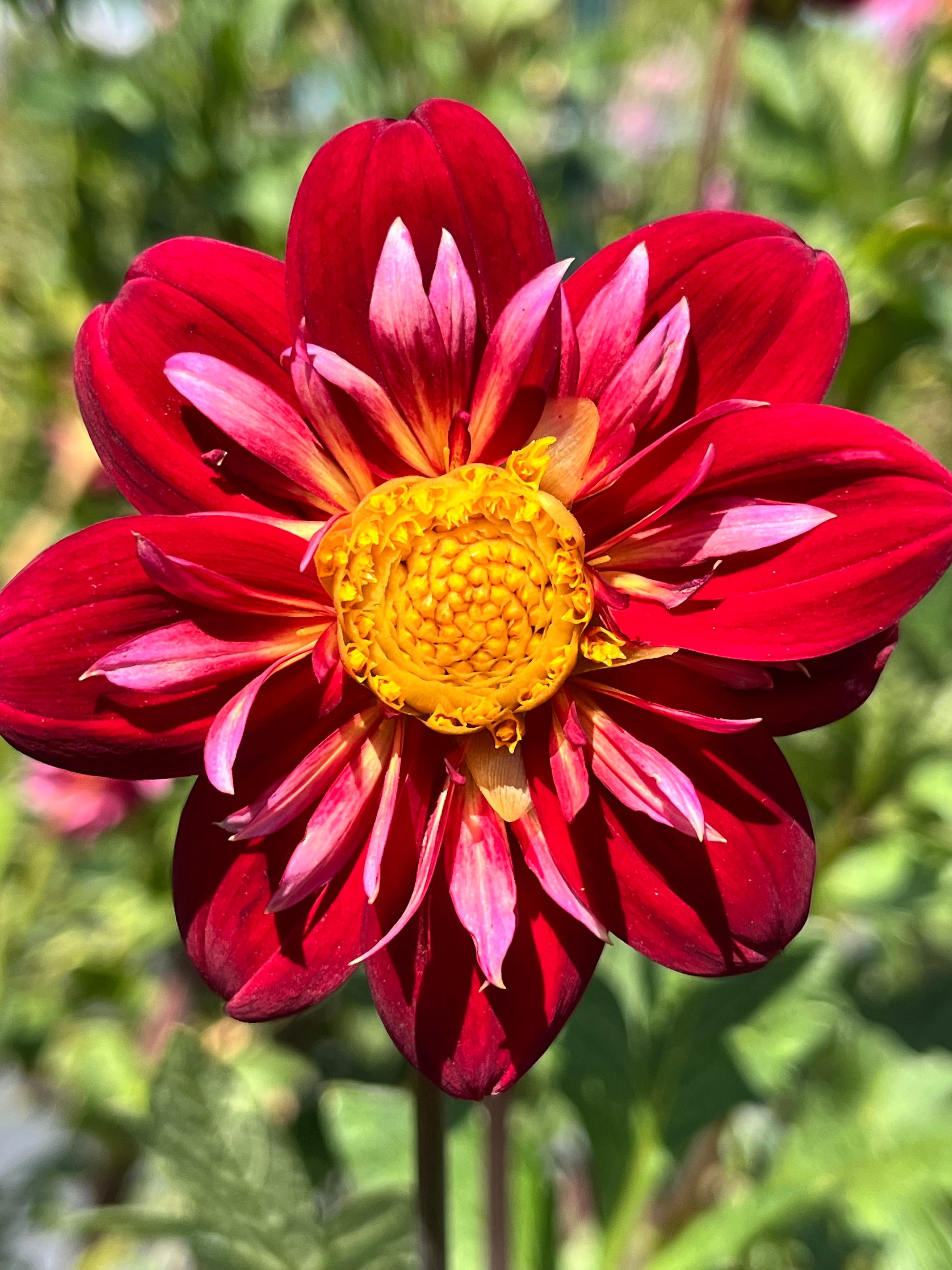 A striking collarette dahlia with rich, velvety red petals that surround a playful collar of shorter pink-and-white petals. The golden-yellow center glows against the layered colors, making each bloom a standout. Compact plants keep the flowers right at eye level, perfect for adding cheer to the garden and fresh, whimsical charm to bouquets.